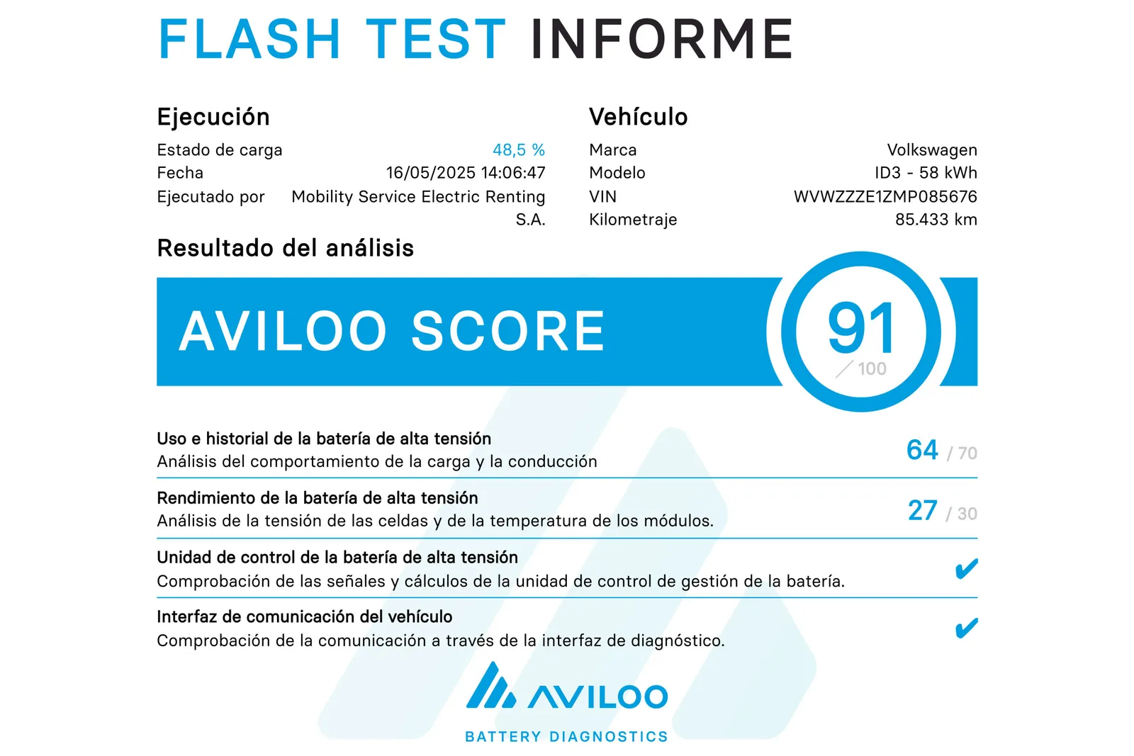 En un vehículo eléctrico ya usado, la clave es verificar el estado de la batería para conocer de antemano su autonomía real estimada. Por eso, todos nuestros vehículos ReDrive cuentan con la certificación de AVILOO, un diagnóstico especializado y reconocido oficialmente para comprobar el estado de salud de la batería (SoH) en vehículos eléctricos, que avala su rendimiento actual y durabilidad. Cuanto mayor es el AVILOO score mejor es el estado de la batería.